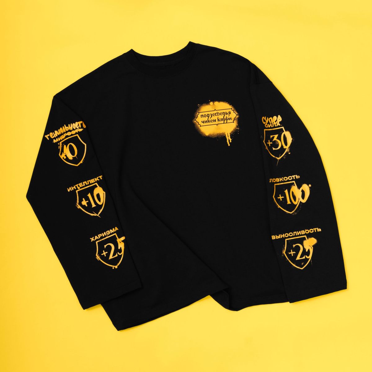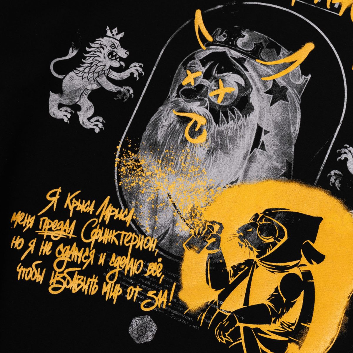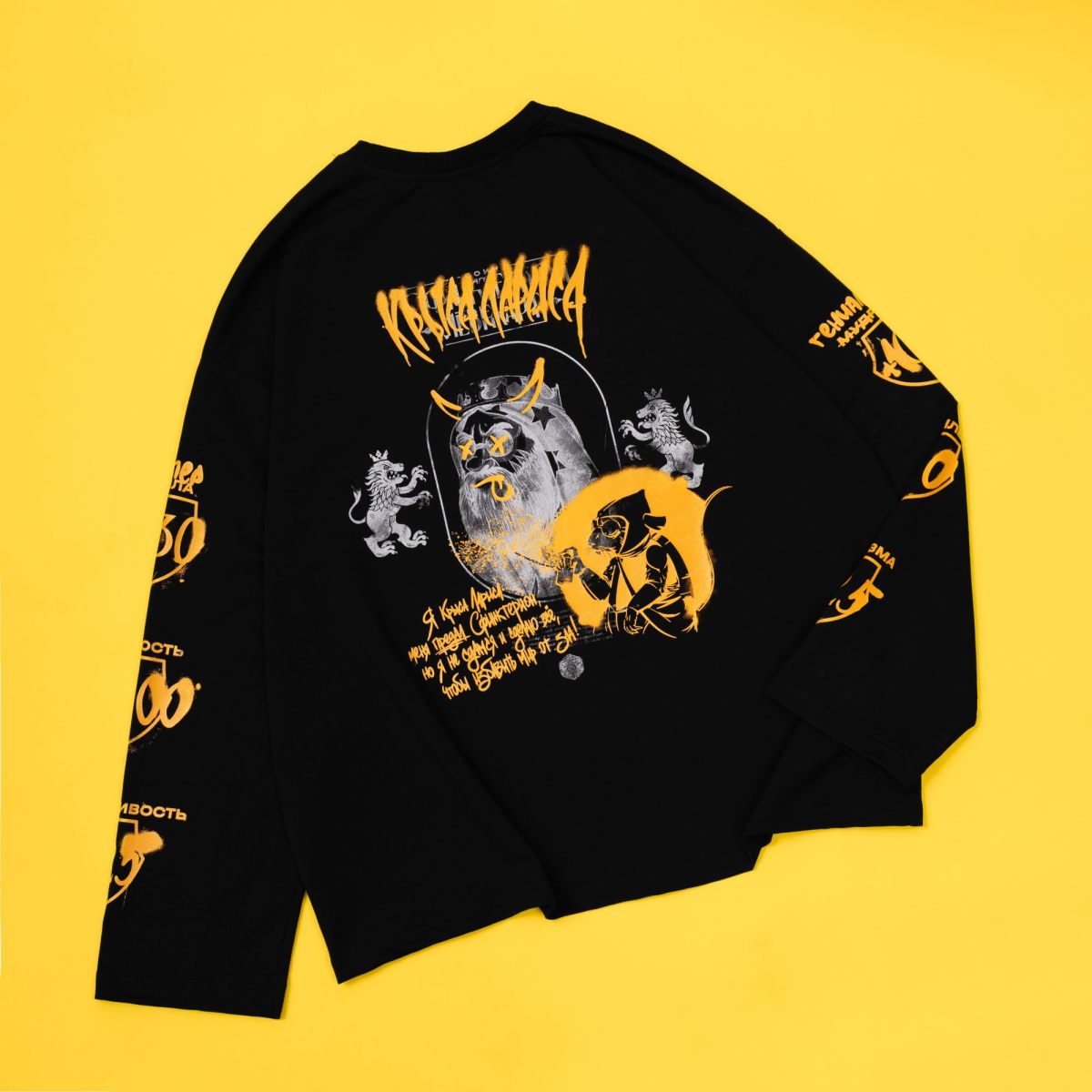 Модель имеет oversized посадку, круглый ворот, сложное нанесение 3-х слойного принта на груди, рукавах и спине.